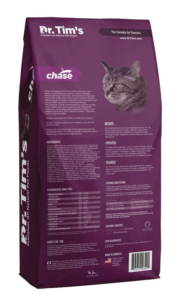 Chase Cat Food has been formulated through the combined efforts of a Ph.D. animal nutritionist and a practicing small animal veterinarian.