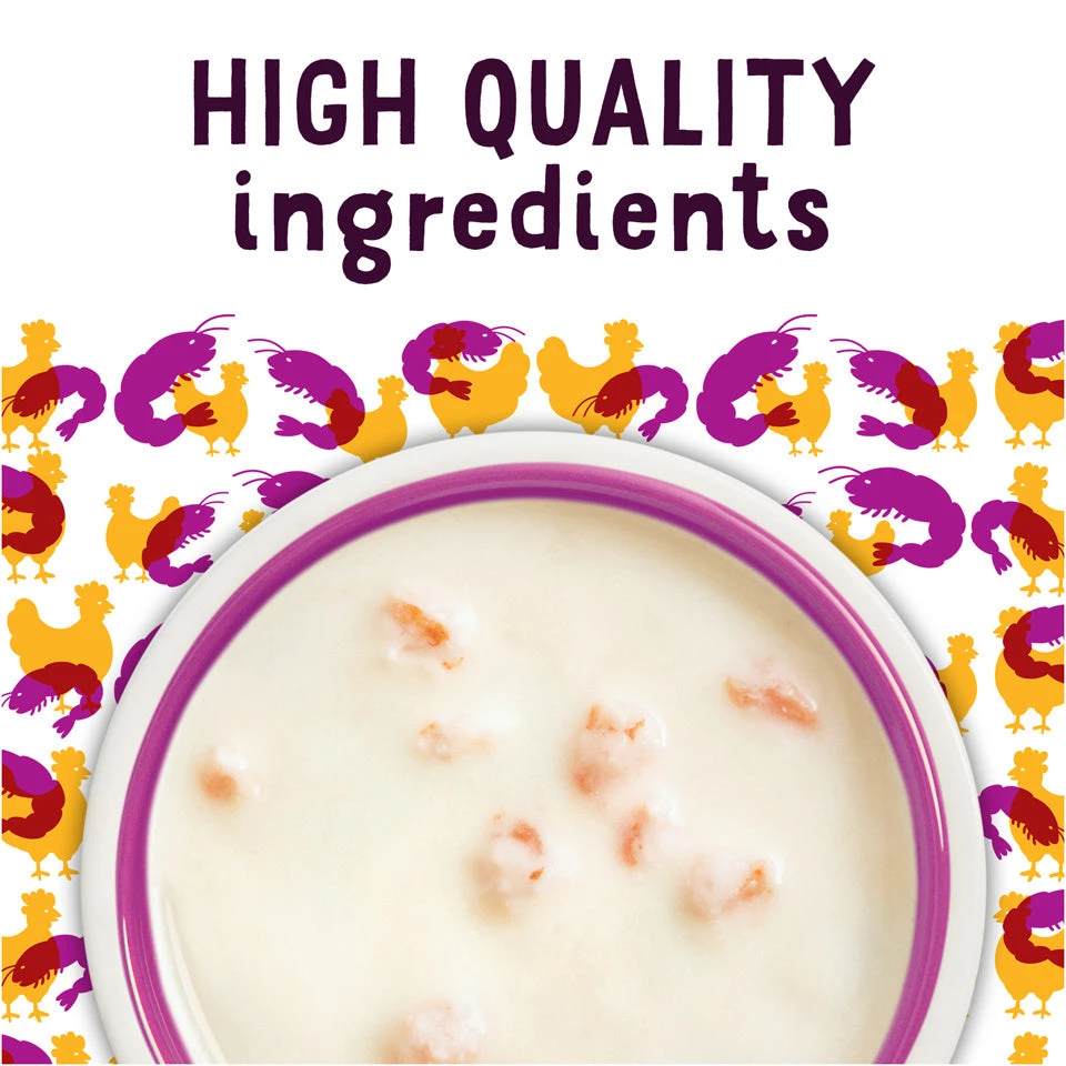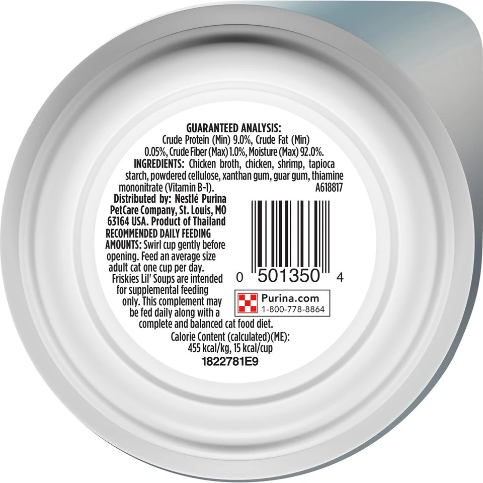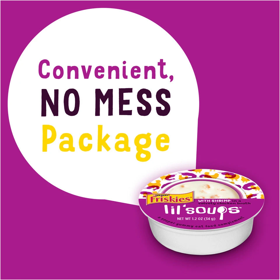 Bring on more playful antics at snack time with your cat when you serve Purina Friskies Lil’ Soups With Shrimp in a Velvety Chicken Broth adult wet cat food complement. This mouthwatering recipe features real chicken, shrimp and other high-quality ingredients for a wholesome way to satisfy her insatiable cravings between meals. The savory, velvety broth brings added flavor and moisture to every delectable nibble, creating a scrumptious food experience that’s sure to keep her happily licking her paws. Intended as a complement to her complete and balanced daily diet, this delightful snack gives you a fun way to treat her to something special. Let your favorite feline know just how much you enjoy spending time with her when you fill her dish with this Purina Friskies Lil’ Soups adult wet cat food complement, and feel good about serving her a product backed by a trusted brand.