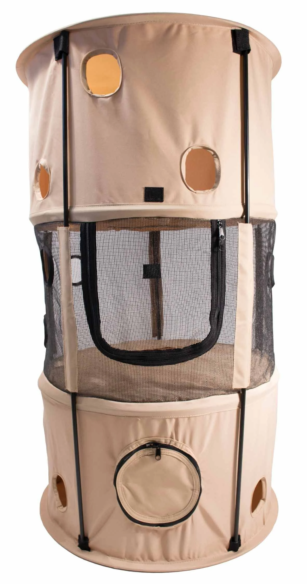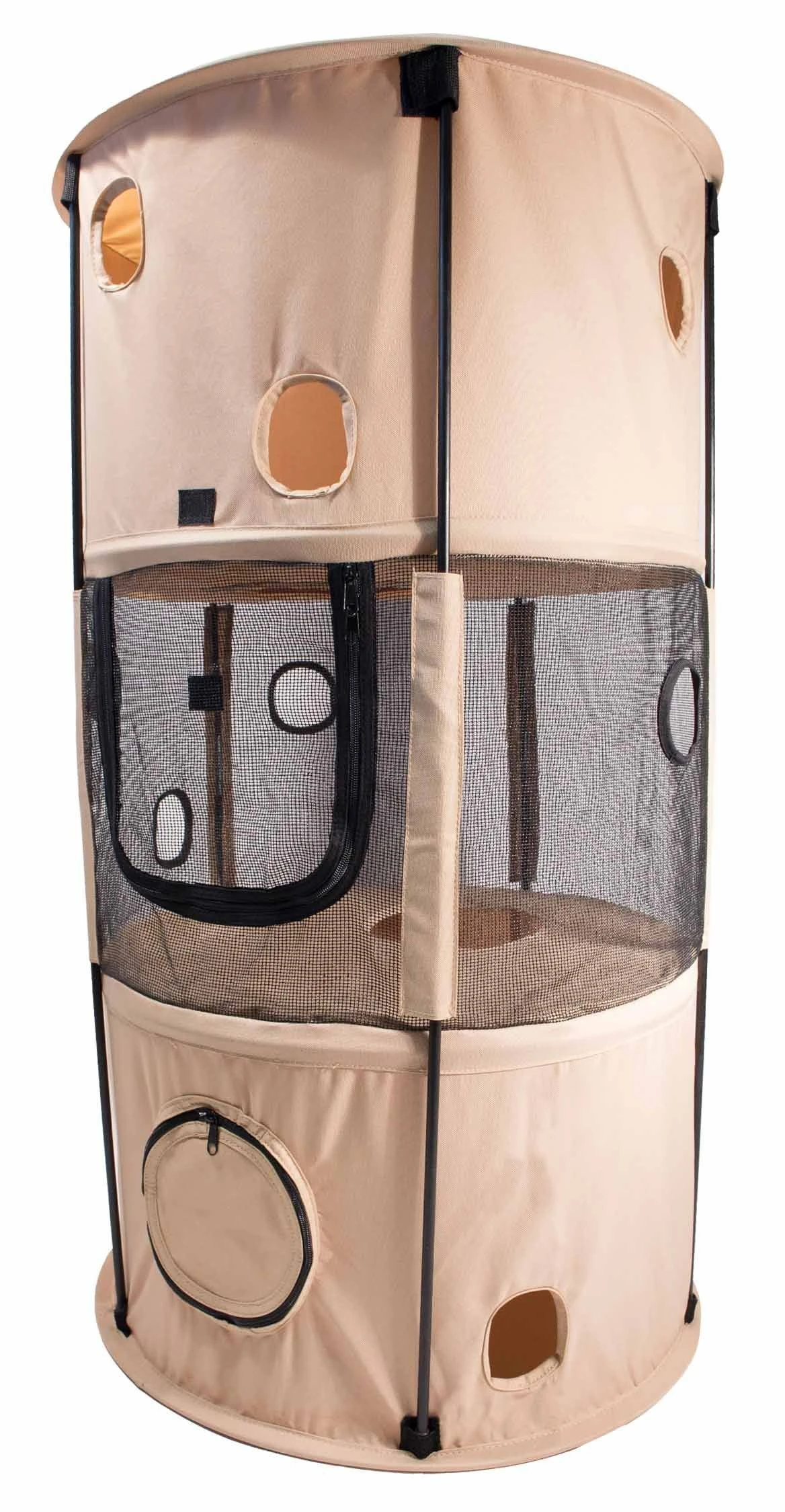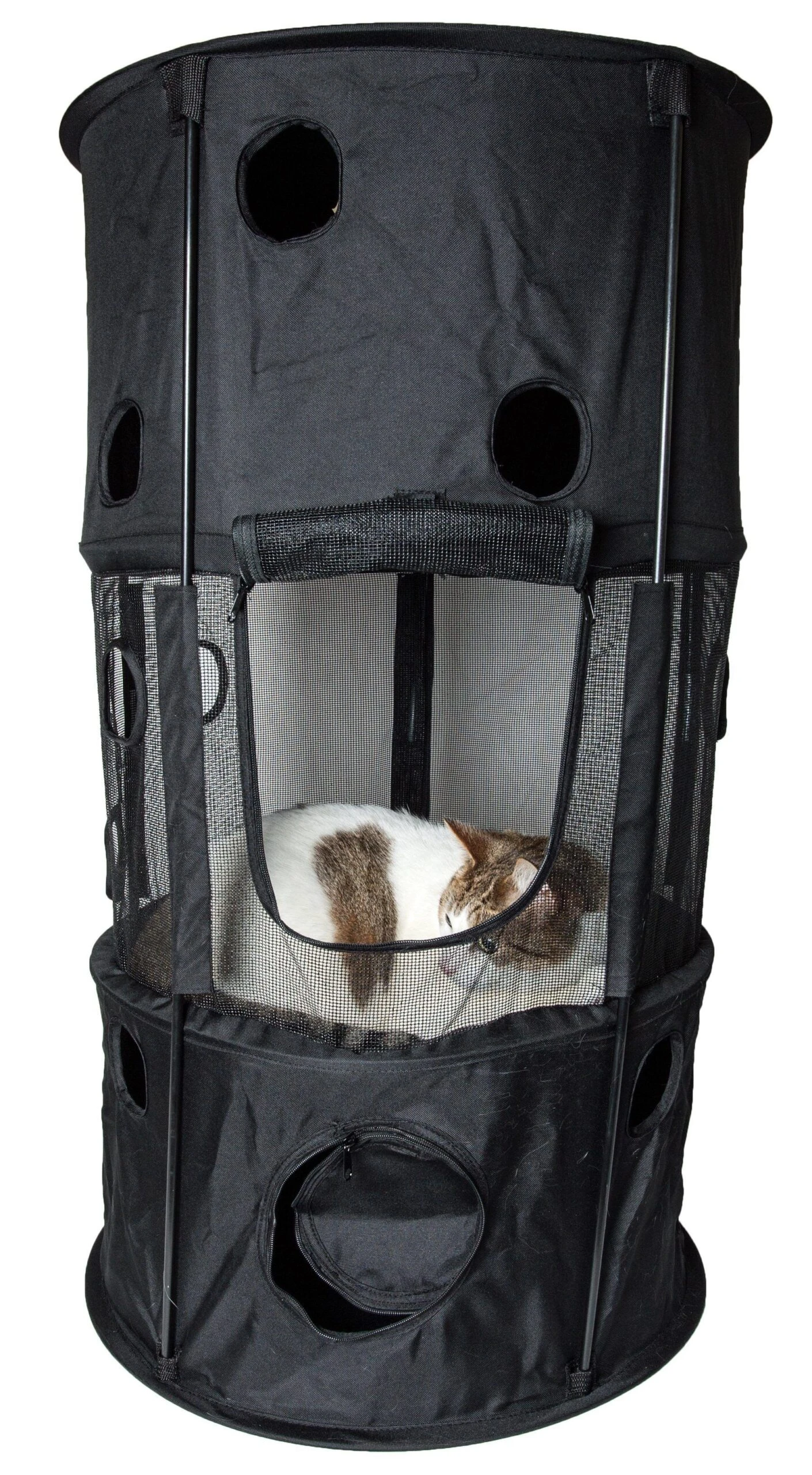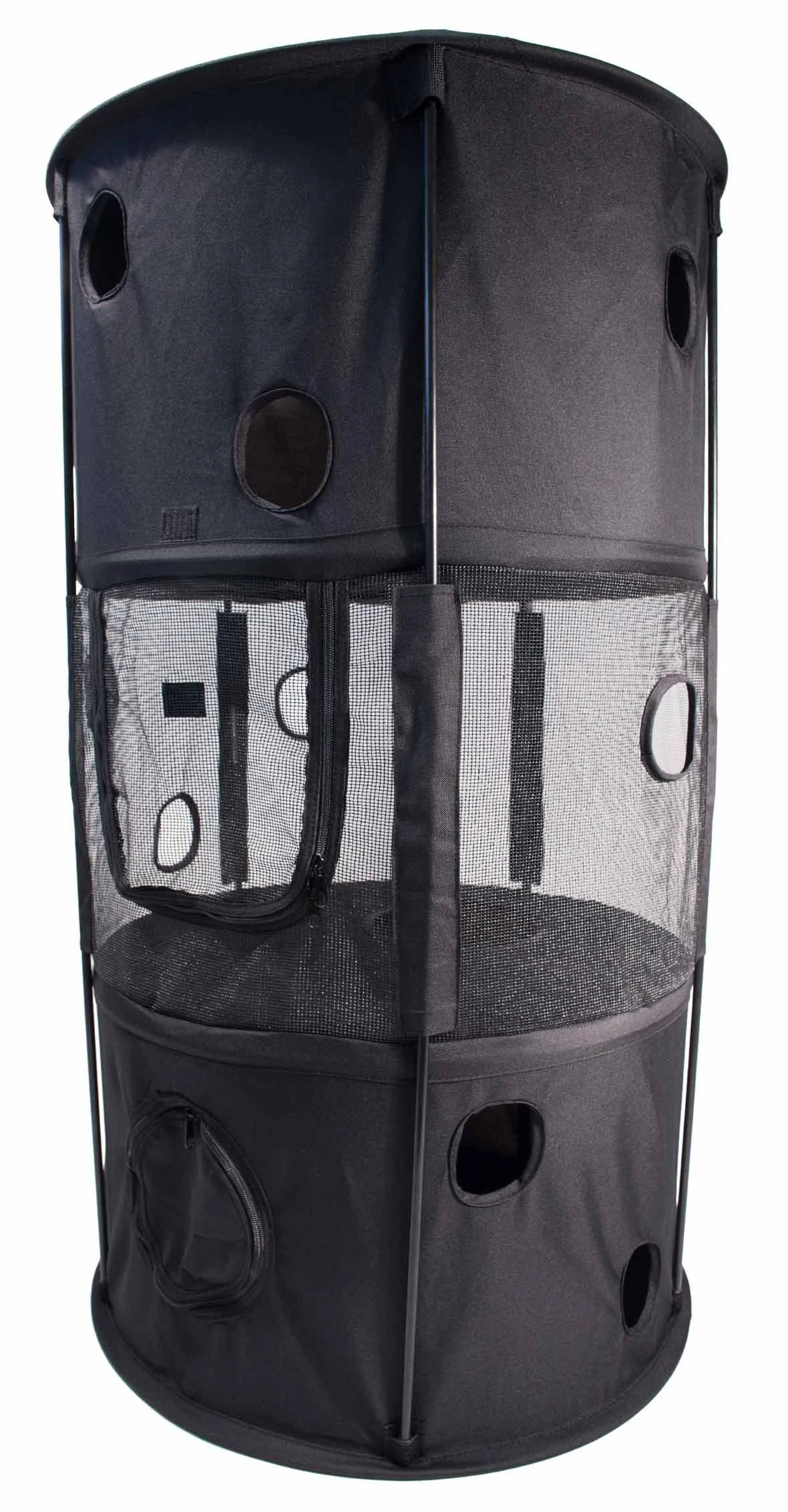 The Pet Life Climbertree circular obstacle collapsible travel Cat House is composed of heavy duty Nylon and mesh. The Climbertree is easy to install or setup compared to the bulkier conventional cat houses. Perfect for Travel, Indoor or Outdoor usages, simply folds and collapses and features durable collapsible fiberglass poles that easily attach to the 4 corners to hold up it’s structure. Features an array of multiple zippered and circular entrances for interactive play on both the bottom and secondary levels. Great for lounging or interior play. Available in Multiple Colors.