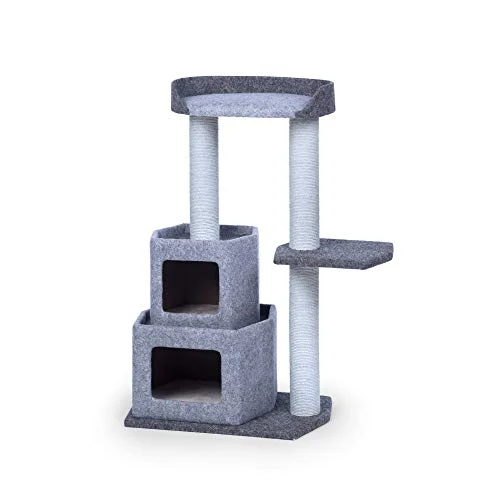 The Prevue Hendryx Kitty Power Paws Sky Condo is a elegant and sophisticated multi-faceted playground for cats of all shapes, sizes, ages and breeds. With classy shades of blue and gray, the unit is sleek and visually agreeable with nearly any room in your home, saving your precious furniture from the consistent scratching and clawing of your lovable cat. The unit combines soft felt fabrics with durable jute rope and provides a padded day bed with a “U” shaped backing to make cats feel more secure and less vulnerable, while featuring three distinct scratching posts, two cozy, plush lined beds and a jumping platform so that cats can practice their natural pouncing abilities at different heights. The texture of the unit itself is very attractive to cats and will help to significantly reduce inappropriate scratching behaviour and safe your expensive furniture. The unit has a low spacial footprint and is well suited for homes without a lot of additional space.