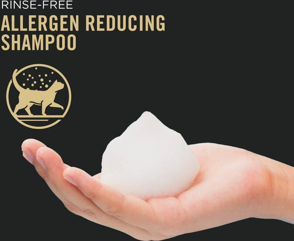 - Rinse-free, dry shampoo for cats shown to reduce the allergens in cat hair and dander.